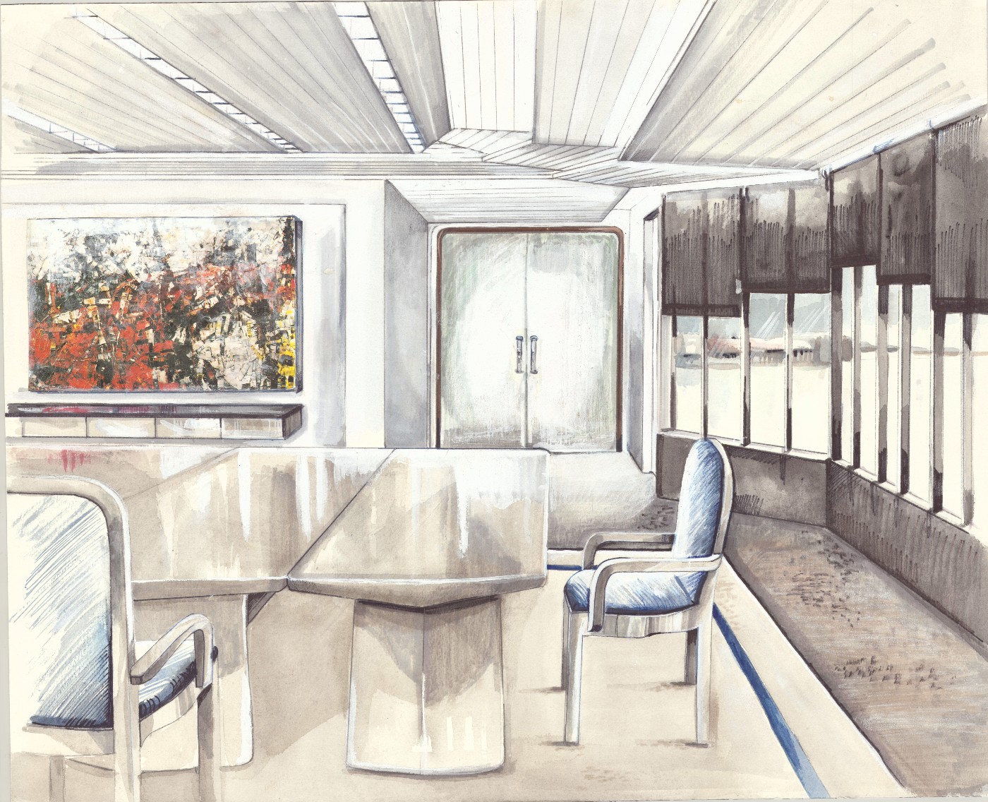 - Aquarelle représentant le design intérieur proposé pour la salle à manger Frontenac, vers 1980